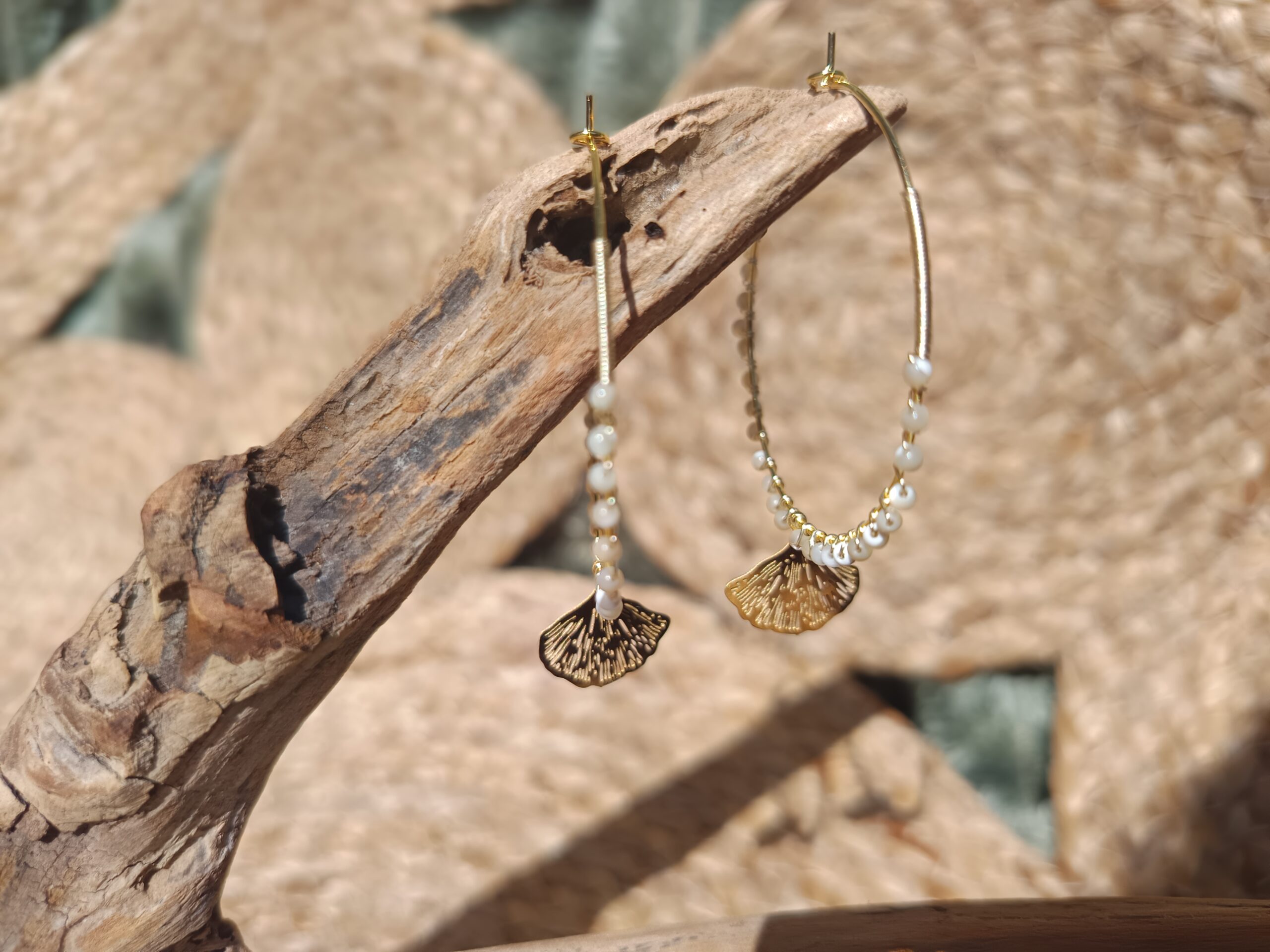 Les créoles Nacre Divine jouent la carte de la pureté avec des perles de nacre associées à une feuille dorée lumineuse. Idéales pour une tenue de cérémonie, une touche raffinée au quotidien, ou pour offrir un bijou chargé de symbolique.
