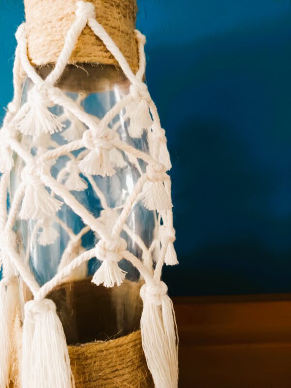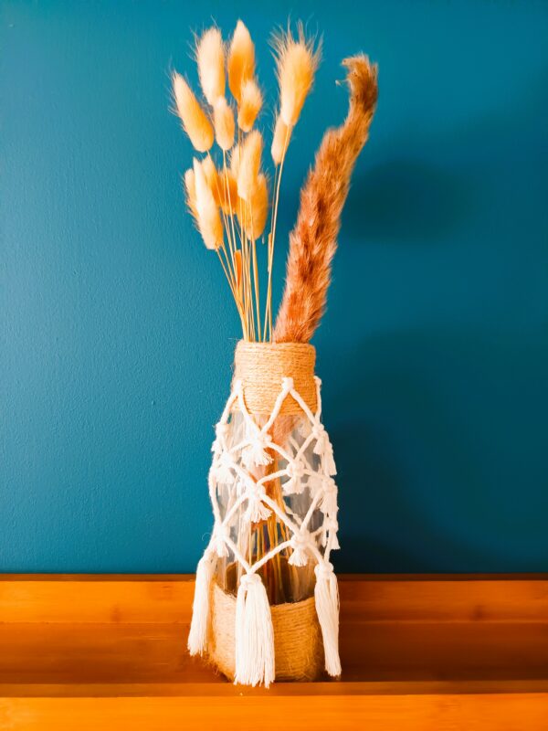 Le vase Lys séduit par sa forme élancée et son habillage élégant. Conçu à partir d’un pot en verre recyclé, il est sublimé par une corde en jute naturelle enroulée et un délicat filet en macramé noué à la main.
